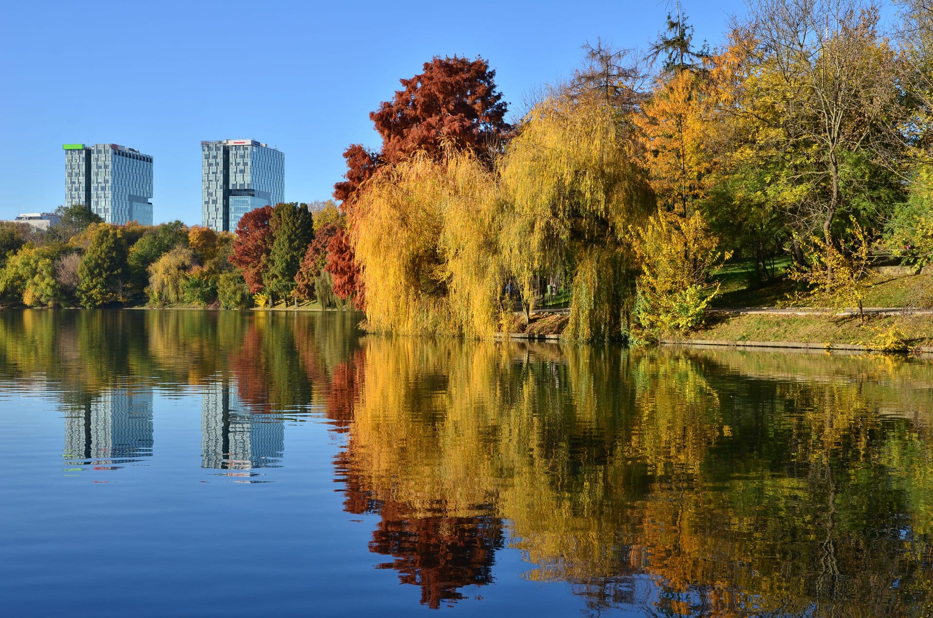 a body of water with trees and buildings in the background